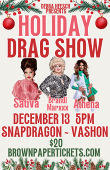 Debra Heesch presents a Holiday Drag Show at Snapdragon - Vashon Island on Saturday, December 13th, bringing a glitter-filled evening of festive cheer and glamorous performances to the island. The night kicks off with a social hour at 5:00 PM - sip, mingle, and ease into the holiday spirit before the spotlight turns to the main event. At 6:00 PM, the drag show takes center stage, featuring dazzling queens Sativa, Athena, and Brandi Marxxx, each bringing their own unique sparkle, humor, and holiday magic. This lively celebration promises plenty of laughter, show-stopping looks, and memorable moments to brighten the season. Tickets are $20 (+ fee), it's general admission seating, and first come first serve.